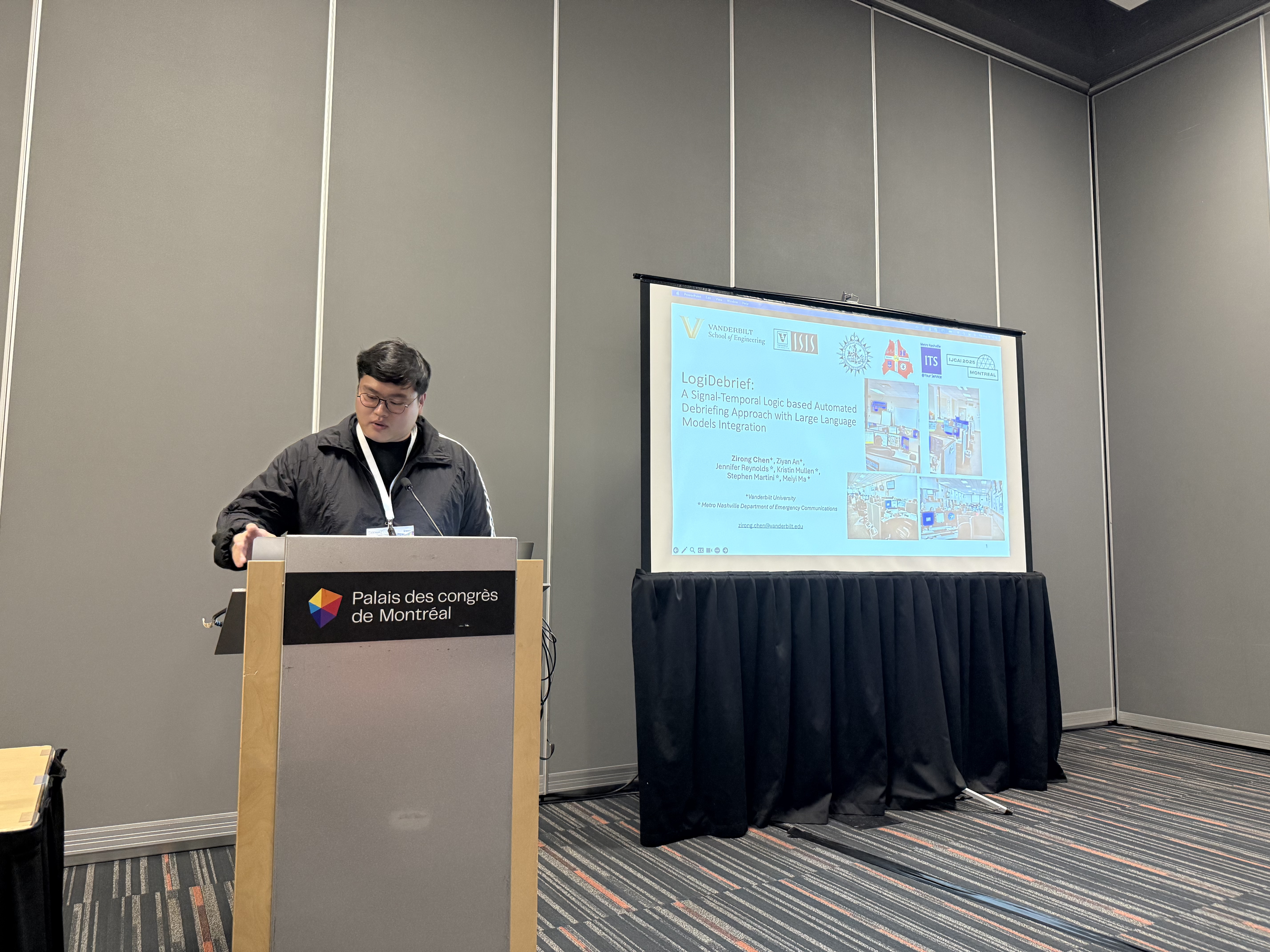 August 2025, Zirong presented our paper "LogiDebrief: A Signal-Temporal Logic based Automated Debriefing Approach with Large Language Models Integration" at the IJCAI conference.